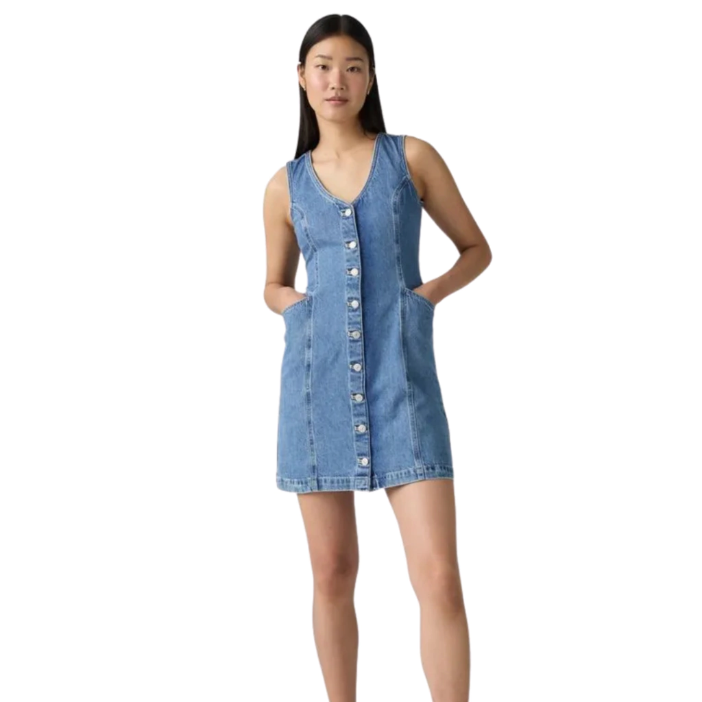 Este vestido tiene todo el estilo clásico western llevado a un siguiente nivel de modernidad. Su corte es regular, sin mangas, cuello V y largo que llega por debajo del muslo; es la representación de la frescura.